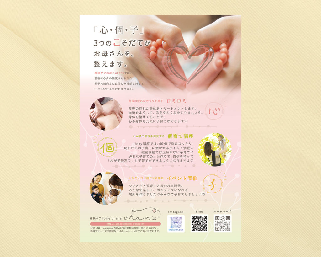 A6版チラシと違い、一つ一つの事業について、オーナーである吉田様の思いを伝えています。打ち合わせでは言葉作りを重点的に行い、その過程でキャッチコピーを制作。言葉に沿ったデザイン制作に注力しました。